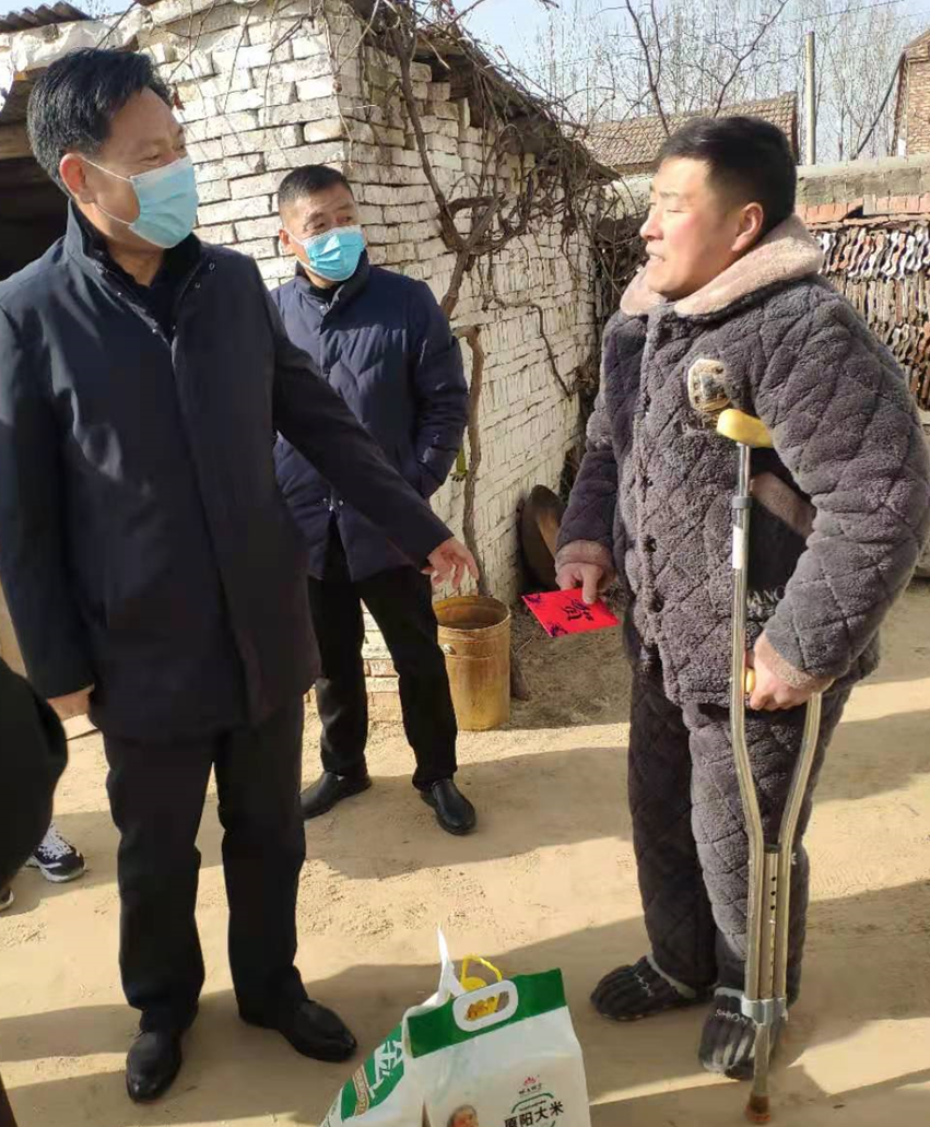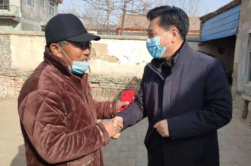 2021年春节临近,学校党委心系宁陵县结对帮扶贫困群众,为了使困难群众欢度春节,传递党的温暖和关怀,按照学校与宁陵县结对帮扶精准扶贫工作要求,2021年1月12日上午,学校组成以校长王国福带队,纪委书记王修法、党政办公室主任李春阳、党政办公室副主任陈建涛、宣传统战部副部长李婕等一行六人的慰问组,深入到商丘市宁陵县柳河镇张庄村,对困难群众进行走访慰问。商丘市人大常委会副主任、宁陵县委书记李振兴,宁陵县政府县长马同和,宁陵县政府副县长胡鹏,宁陵县扶贫办主任米金华等同志陪同前往。