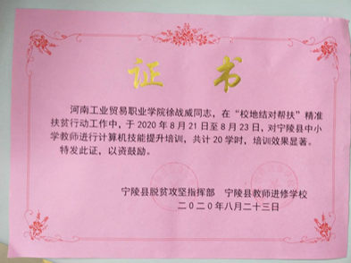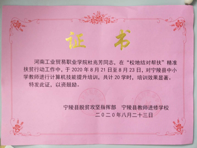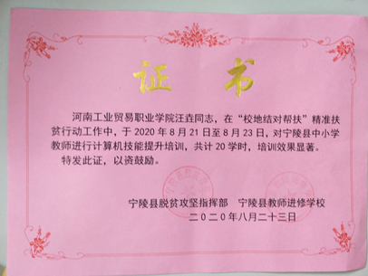 信息工程系将“校地结对帮扶”作为系里一项重要工作,由系负责人直接推进,制定方案,选派优秀老师,组织实施。 2018年11月制定了“信息工程系与宁陵县结对帮扶精准扶贫行动工作方案”,2019年先后派黄腾飞等老师到宁陵县授课。为落实2020年7月河南工业贸易职业学院《关于印发《“校地结对帮扶”工作整改实施方案》的通知》(豫工贸党〔2020〕103号)的精神和要求,针对宁陵县中小学教师开展信息化培训事宜,2020年8月6日,制定了信息工程系“校地结对帮扶”实施方案,分批次对宁陵县中小学骨干教师进行培训。