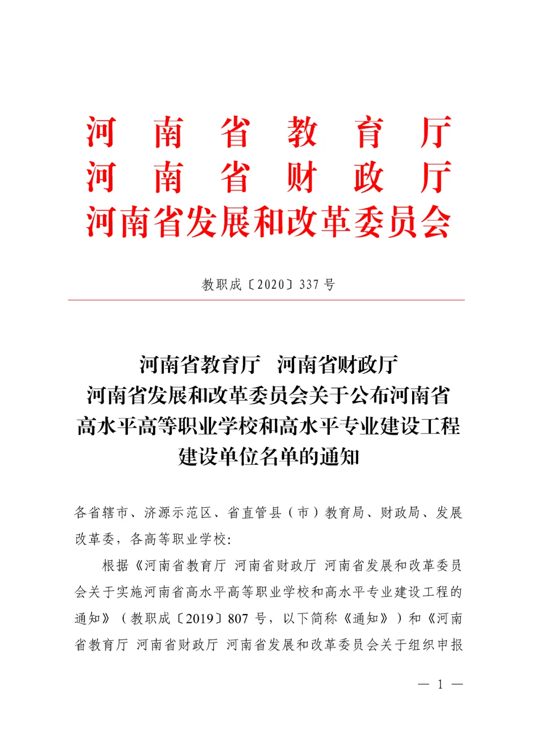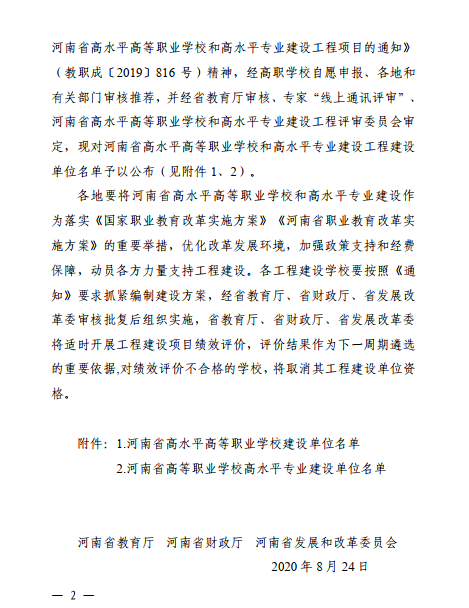 据悉,为深入贯彻落实《国家职业教育改革实施方案》和全省教育大会精神,全面落实《河南省职业教育改革实施方案》,进一步加强职业院校内涵建设,实现职业教育高质量发展,省教育厅、省财政厅和省发展改革委决定启动实施河南省高水平高等职业学校和高水平专业建设工程(简称“高职双高工程”)。按照建设教育强省和办好新时代职业教育的新要求,重点建设一批高水平高等职业学校和高水平专业群,是打造中部地区技术技能人才培养高地的重要举措,是提升我省高素质技术技能人才培养质量的重要步骤,是我省办好新时代职业教育的重要途径。