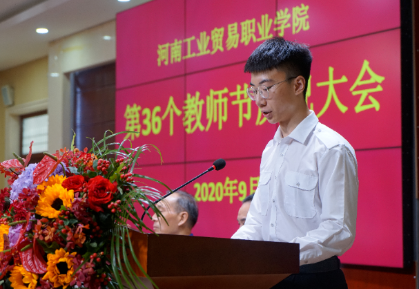 学生代表毛家辉作了发言,代表全体同学祝各位老师节日快乐、身体健康,赞扬老师们用自己的行动践行着教育者的初心与使命、责任与担当,表达对老师们在疫情面前勇做最美的教育逆行者的崇高敬意,表示将以拳拳感恩之心付诸行动,让青春在奋斗中闪光。
