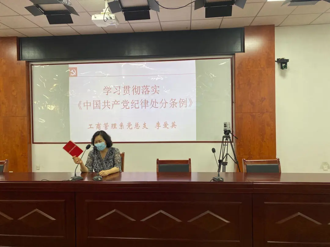 系列活动一:“党课开讲啦”。2020年6月19日上午9点工商管理系党总支副书记李爱英同志在行政楼一楼招聘会议室以《学习贯彻落实中国共产党纪律处分条例》为专题给全体党员上了一堂生动的党课。