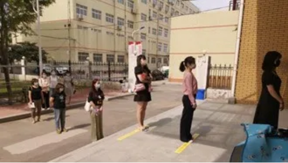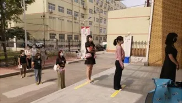 在宿舍门入口处,教师模拟学生保持一定间距,一列纵队有序进入宿舍。严格保持社交距离,并佩戴口罩。