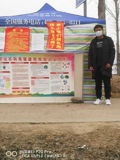 王豪寅是贸易经济系2019级市场营销专业的学生,家住河南省辉县市。在基层党组织的号召下,他毅然决然投入到防疫第一线。从1月27日开始,他配合赵凝屯村党支部开始了执勤、登记、巡逻、消毒等任务。在社区门口值班站岗一个多月以来,他每天早起晚睡,非常辛苦。有人问他,“每天执勤工资多少”,他回答的是“完全志愿没有工资”,他还为防疫捐款500元钱。王豪寅说:“我想为这场抗疫出一份力,比起在武汉的医护人员自己的奉献是九牛一毛,但是我一定做到随时听候调遣,无条件服从安排。我相信疫情终将被伟大的中国人民战胜!”