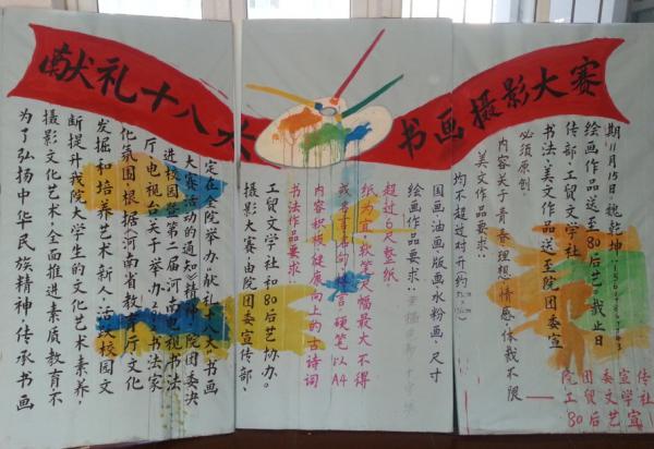 二、10月下旬,举办了“献礼十八大”书法绘画摄影比赛活动。为庆祝十八大的顺利召开,我院团委组织开展了书法绘画评选活动,全院学生积极参与,用书法和绘画表达了对祖国未来的深深祝福。