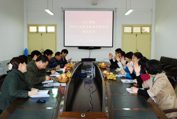 4月13日上午,九三学社河南工业贸易职业学院支社成立大会在学院办公楼会议室召开。九三学社河南省委组织处处长王治华、组织处办公室主任苗红娣,九三学社河南省农大委员会主委文才艺,九三学社河南省农大委员会秘书长王红卫,学院党委书记孙柏梁,副院长刘炜,九三学社河南工业贸易职业学院全体社员参加了会议。会议由九三学社河南省农大委员会秘书长王红卫主持。