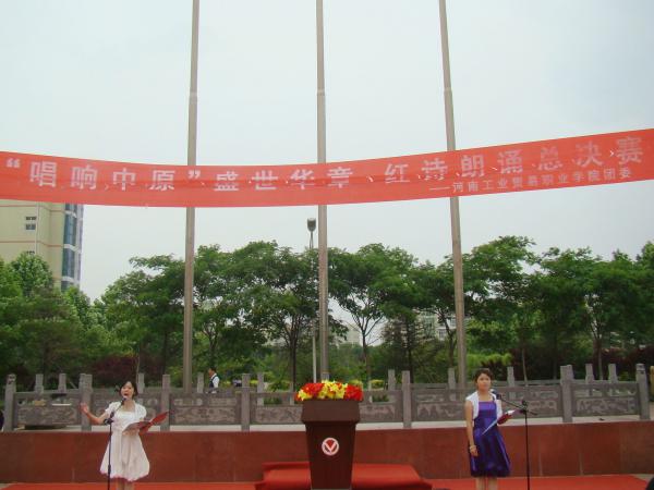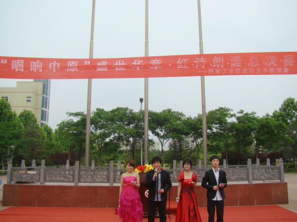 在生机勃发的五月底,在蒲公英飘飞的日子里,河南工业贸易职业学院红旗广场彩旗飘扬,号鼓嘹亮,全校师生欢聚一堂,为庆祝“建党90周年”,弘扬中原文化,激发我院青年热爱祖国,为实现中原崛起贡献力量,我院开展了“唱响中原 盛世华章”红诗朗诵比赛活动。此次比赛活动历时一个月,在全院掀起了大学生读红诗、诵经典的热潮。