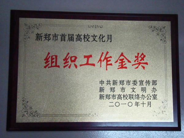 为充分发挥新郑市高等院校聚集的优势,加强各高校之间的联络、沟通和交流,新郑市于2010年9月中旬至10月中旬举办了新郑市首届高校文化月活动。我院积极筹备参加了这次活动,获得了主办方的肯定,并授予组织金奖。