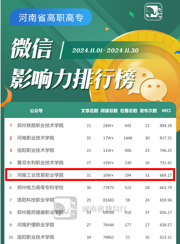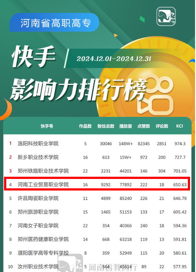 近日,河南省教育厅发布河南省教育系统2024年12月新媒体综合传播力排名。我校微信公众号影响力排名位居河南省高职高专院校微信影响力排行榜第五,这是我校微信公众号连续两个月位居河南省高职高专院校微信影响力排行榜第五。快手号影响力排名位居河南省高职高专院校快手影响力排行榜第四。