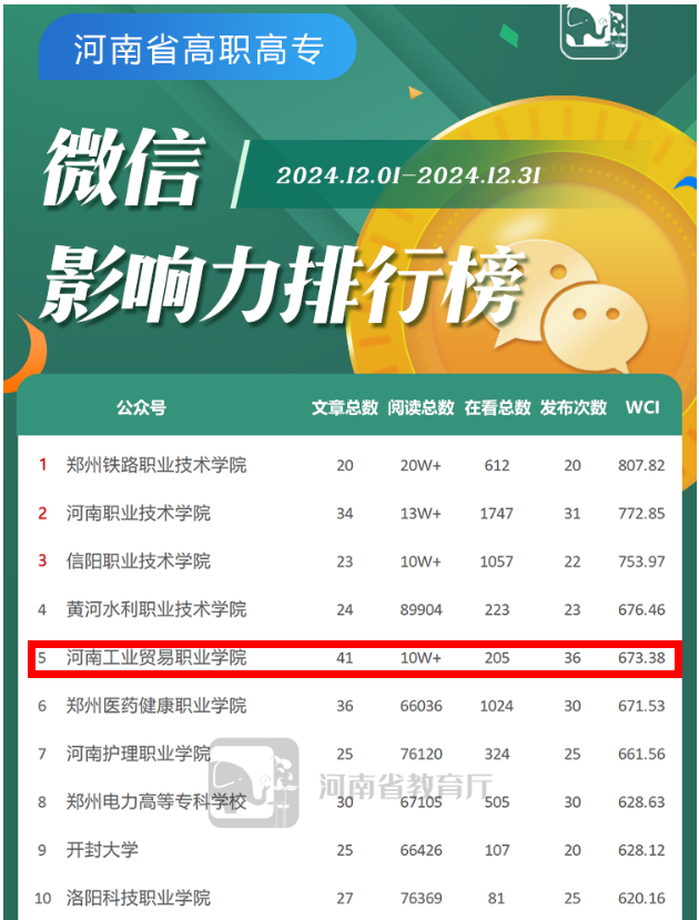 12月,河南省高职高专107个微信公众号保持活跃,矩阵共发文1988次,推文总数为2992篇,文章累计阅读量近350.94万次,矩阵WCI均值为450.23。我校公众号共发文41篇,阅读总数10万+,WCI指数673.38。