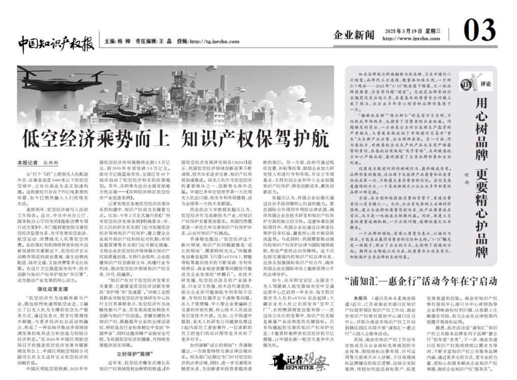 3月19日,中国知识产权报刊发《低空经济乘势而上 知识产权保驾护航》一文中对我校低空经济发展研究中心执行主任乔善勋进行采访。