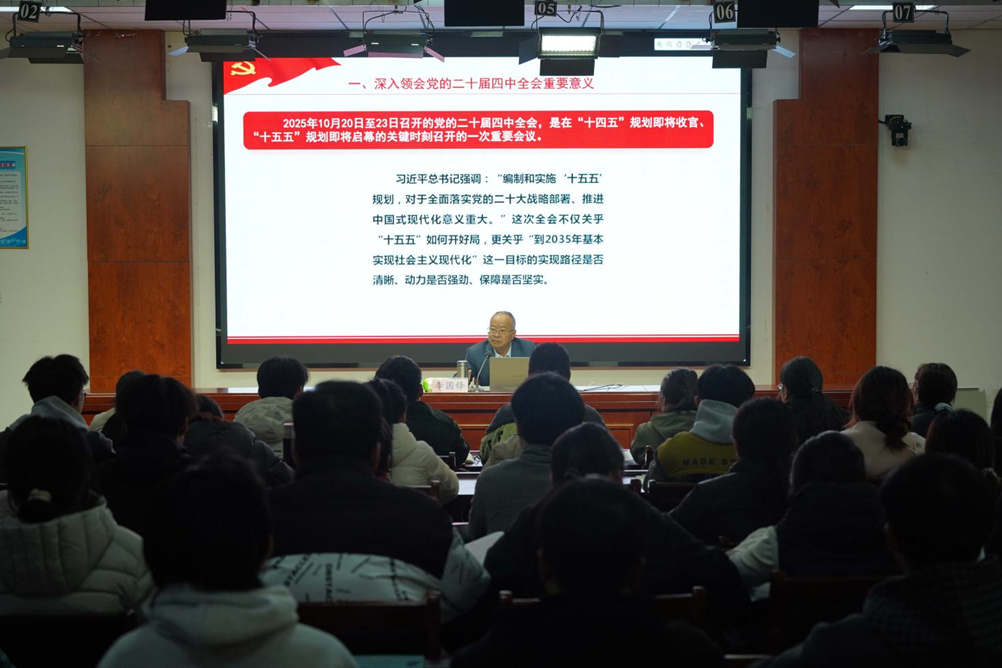 李国锋紧扣党的制度优势、百年党史脉络,结合党的重要会议历程与中共中央全会核心要义,深入阐释二十届四中全会的重大现实意义、鲜明时代特征、核心精神实质以及青年党员发展对象的使命担当与践行要求。他强调,党的二十届四中全会是在“十四五”规划即将收官、“十五五”规划即将启幕的关键时刻召开的一次重要会议,《中共中央关于制定国民经济和社会发展第十五个五年规划的建议》擘画了“十五五”的宏伟蓝图,如何将全会精神转化为助力学校内涵发展、服务国家高质量发展的生动实践,是青年学子必须答好的时代考卷。