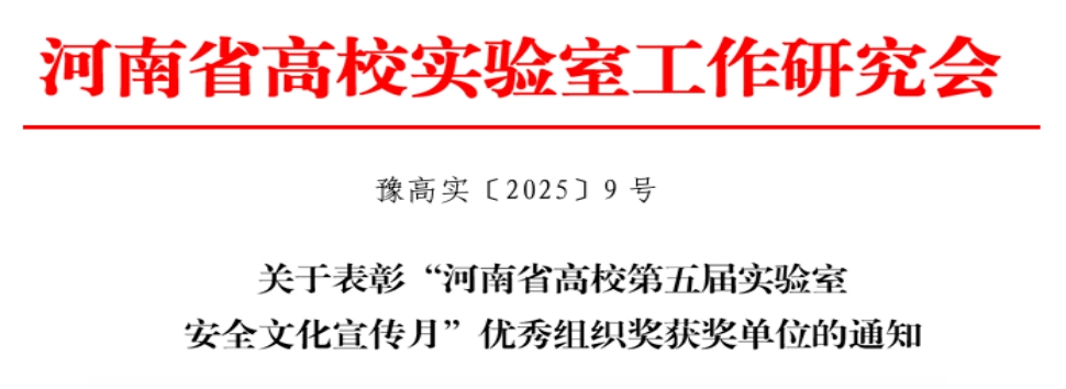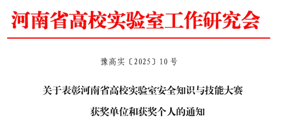 近日,我校在2025年河南省高校实验室安全文化建设与知识技能竞赛中,荣获“河南省第五届实验室安全文化宣传月优秀组织奖”“2025年河南省高校实验室安全知识与技能大赛优秀组织奖”2项集体奖项及6项省赛个人奖项。