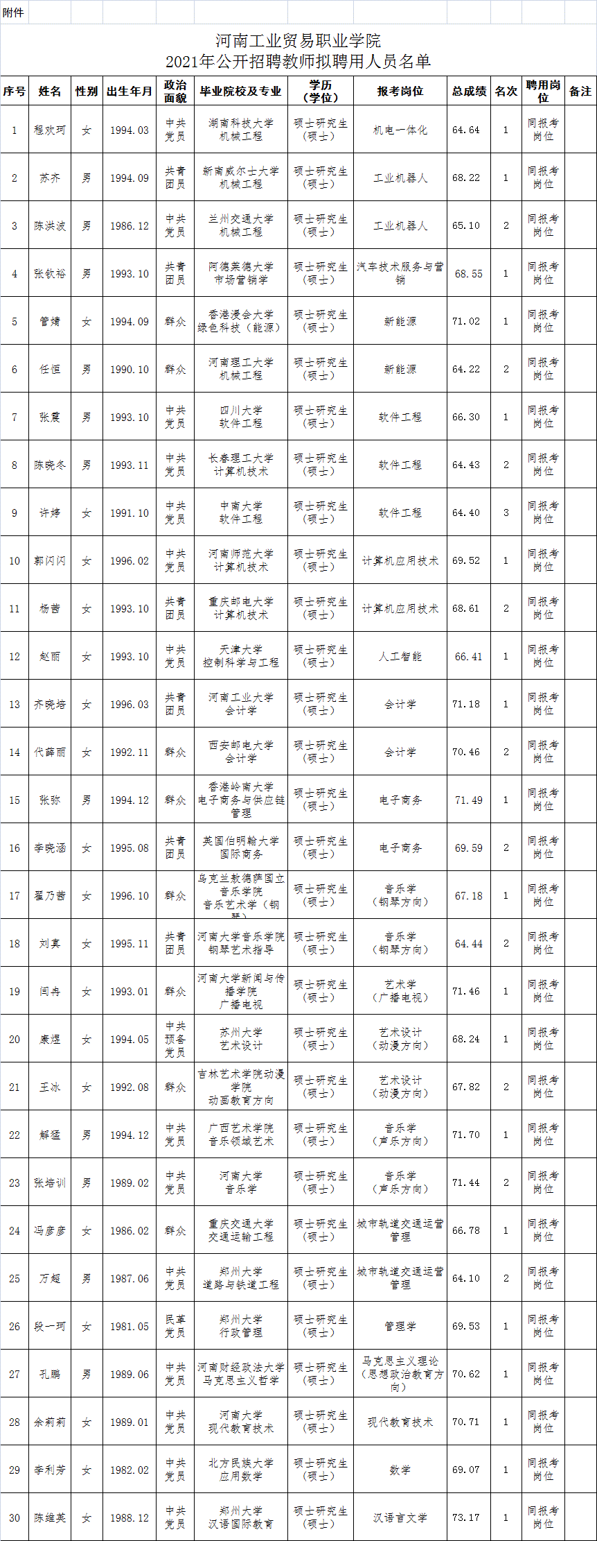 按照《河南工业贸易职业学院2021年公开招聘教师方案》有关要求,我校认真组织了2021年公开招聘教师工作,计划公开招聘教师30人。通过报名、审查、笔试、面试、体检和考察等环节,共确定拟聘用教师30人(名单见附表),现予以公示。