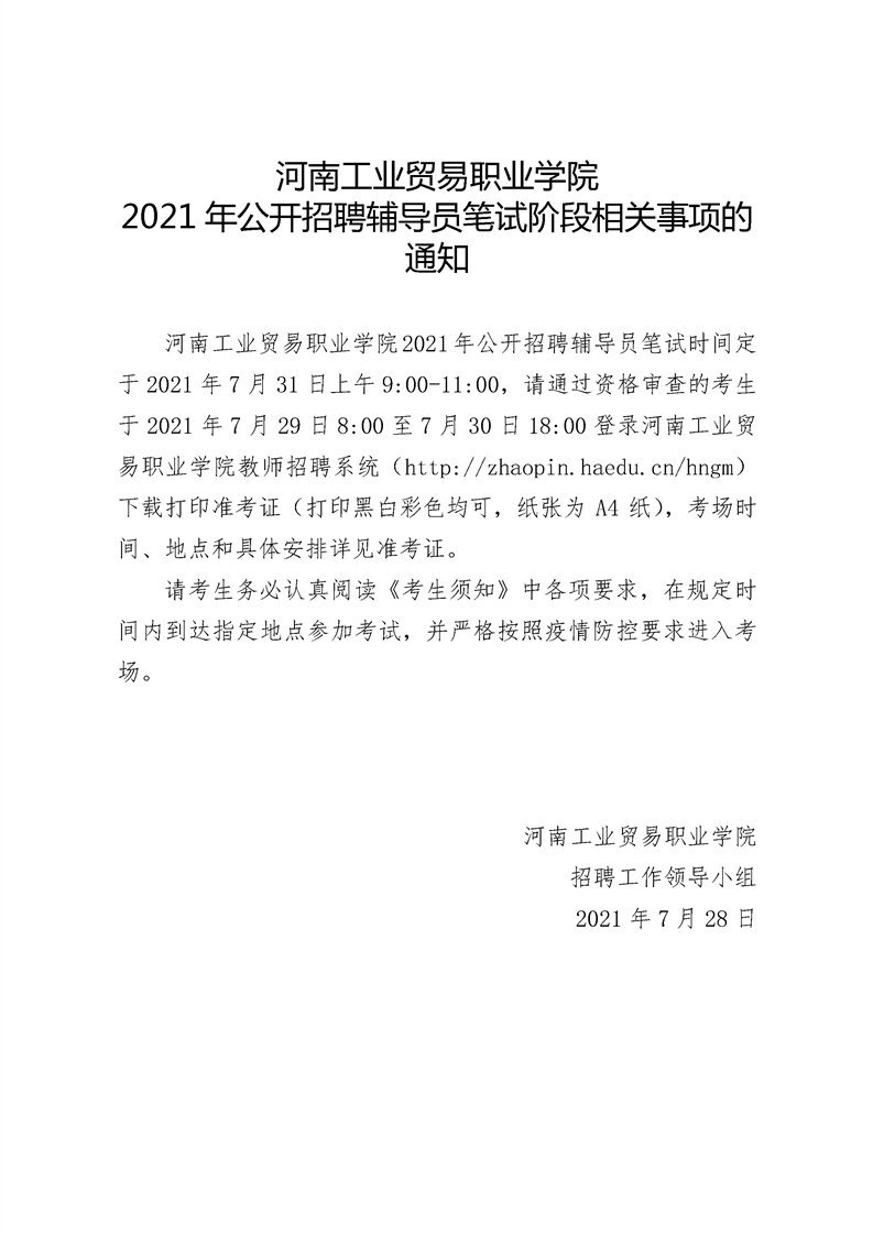 河南工业贸易职业学院2021年公开招聘辅导员笔试阶段相关事项的通知