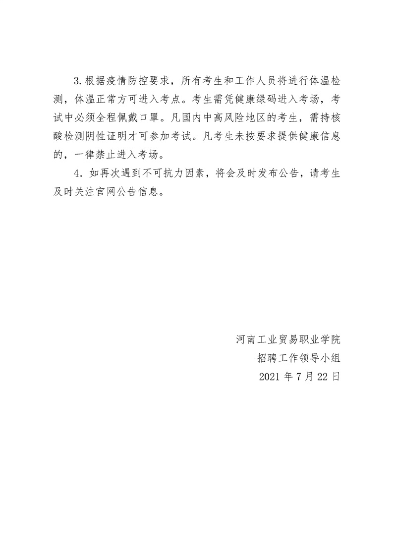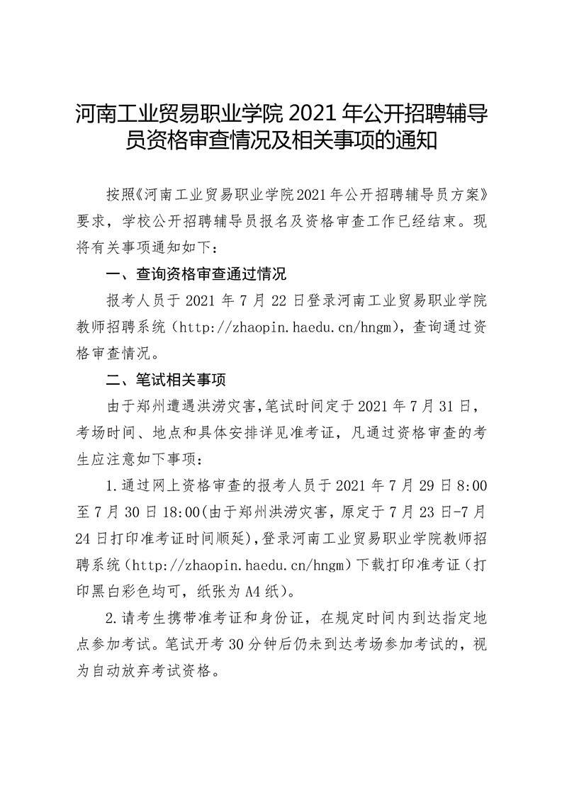河南工业贸易职业学院2021年公开招聘辅导员资格审查情况及相关事项的通知