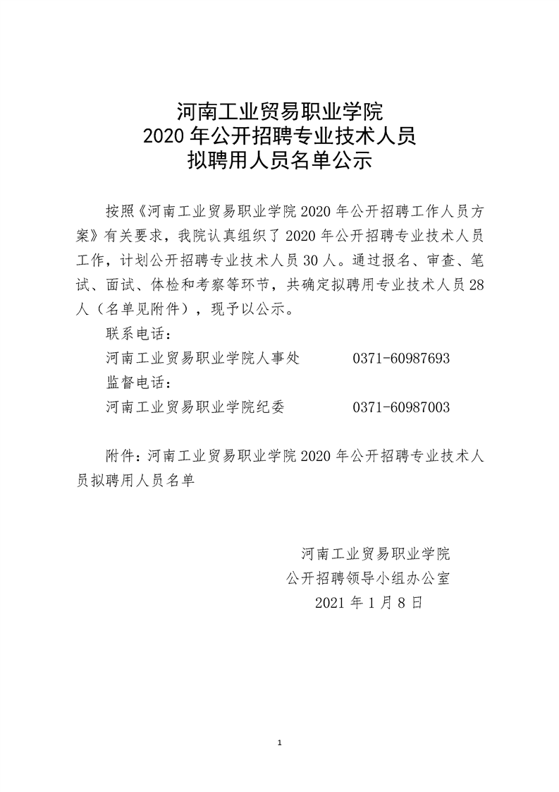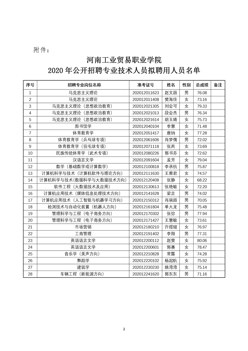 河南工业贸易职业学院2020年公开招聘专业技术人员拟聘用人员名单公示