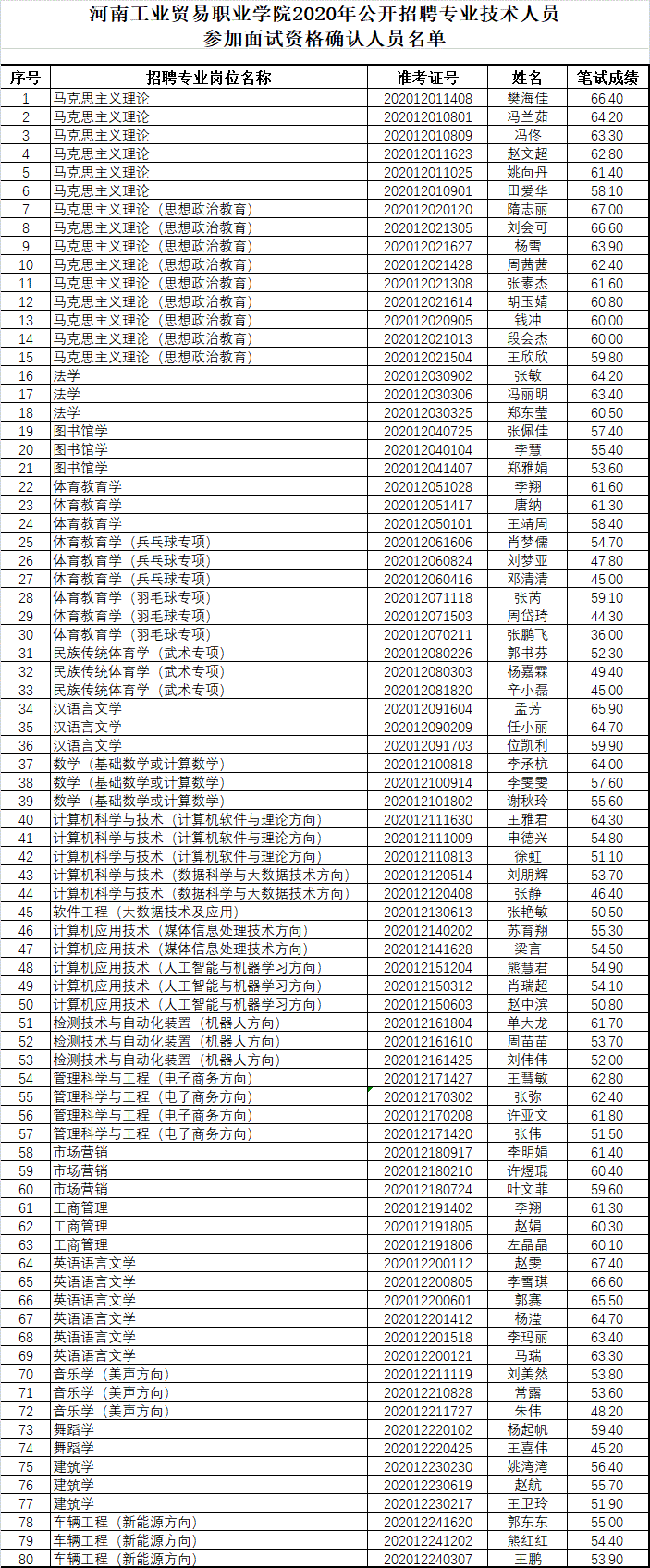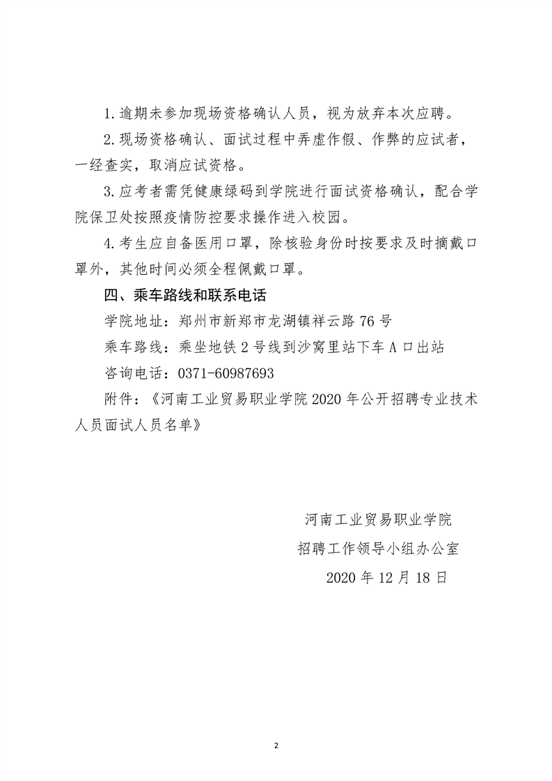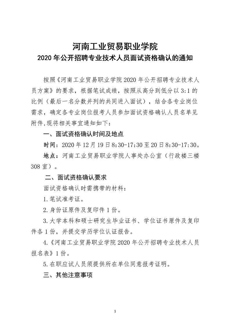 河南工业贸易职业学院 2020年公开招聘专业技术人员面试资格确认的通知