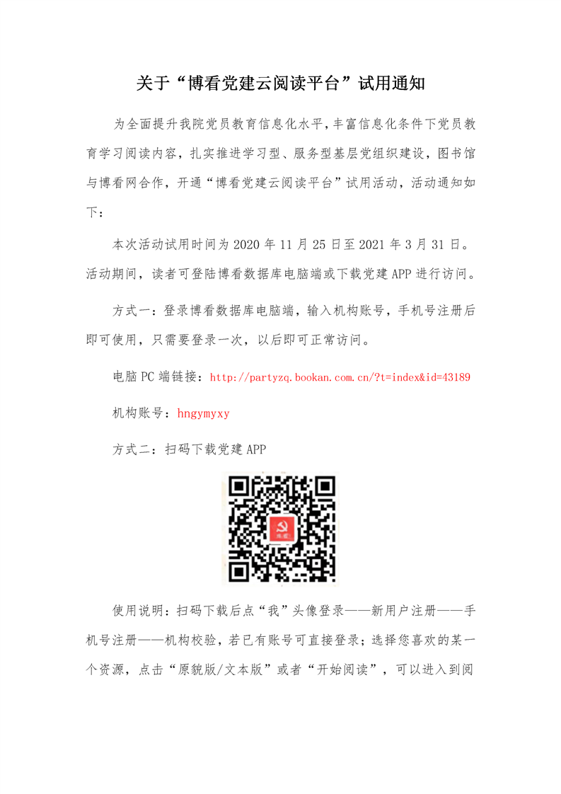 河南工业贸易学院图书馆开通博看党建云阅读试用通知