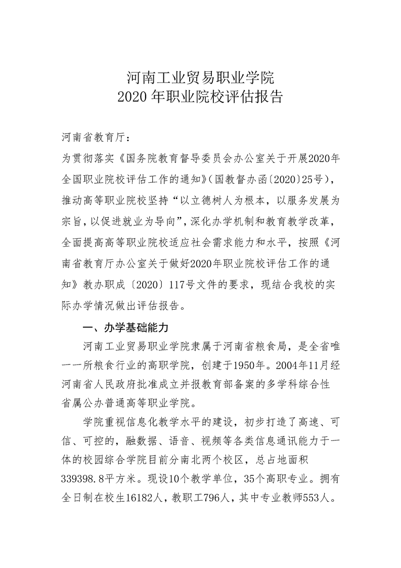 河南工业贸易职业学院 2020年职业院校评估报告