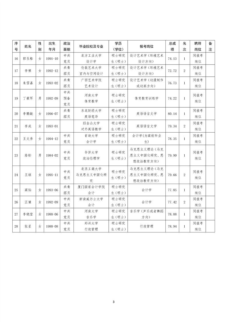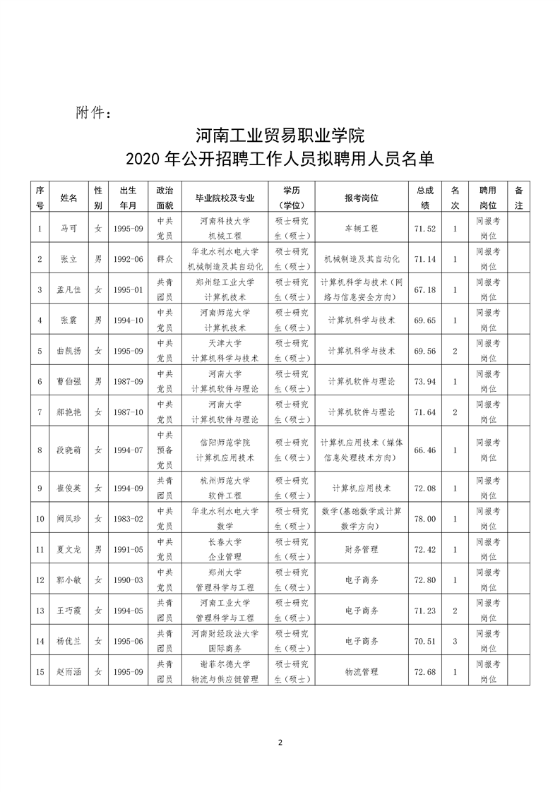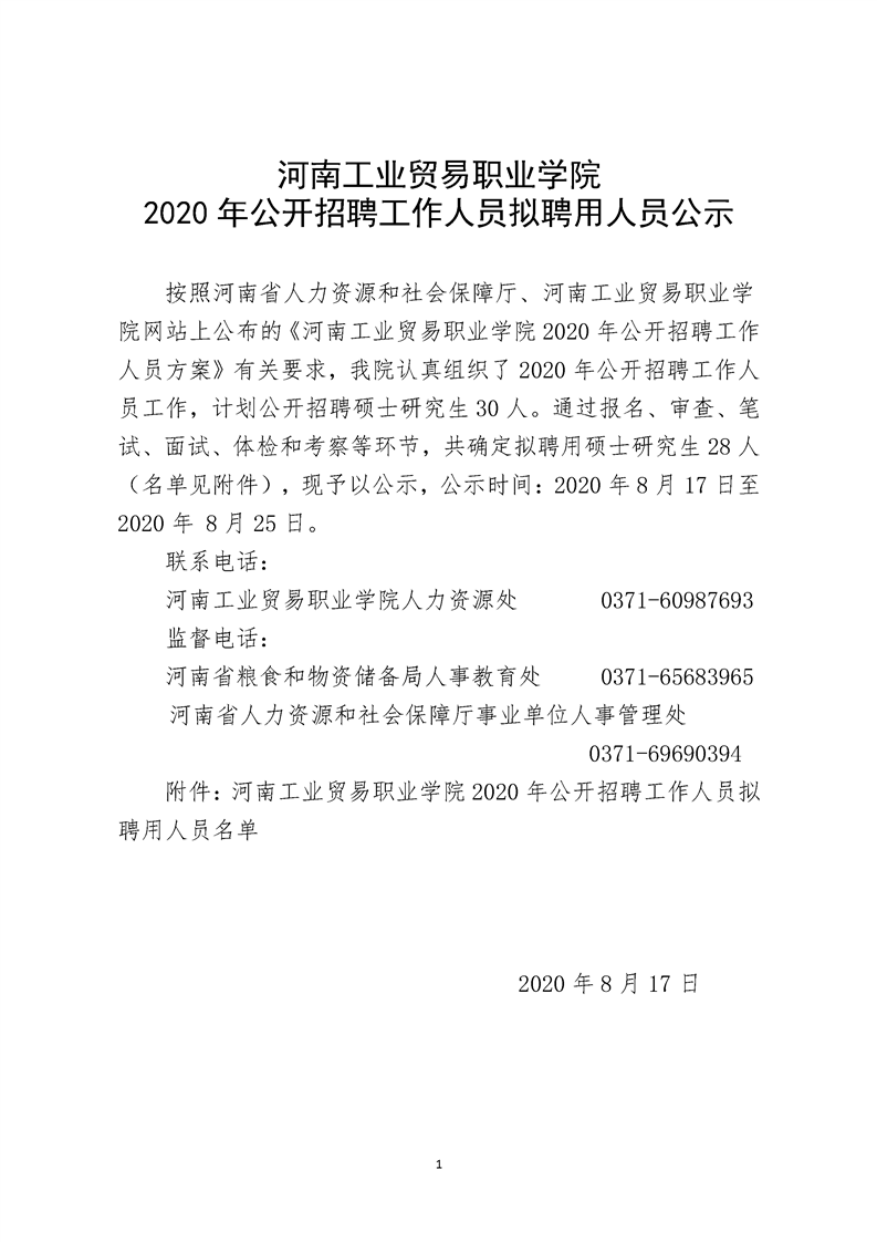 河南工业贸易职业学院 2020年公开招聘工作人员拟聘用人员公示