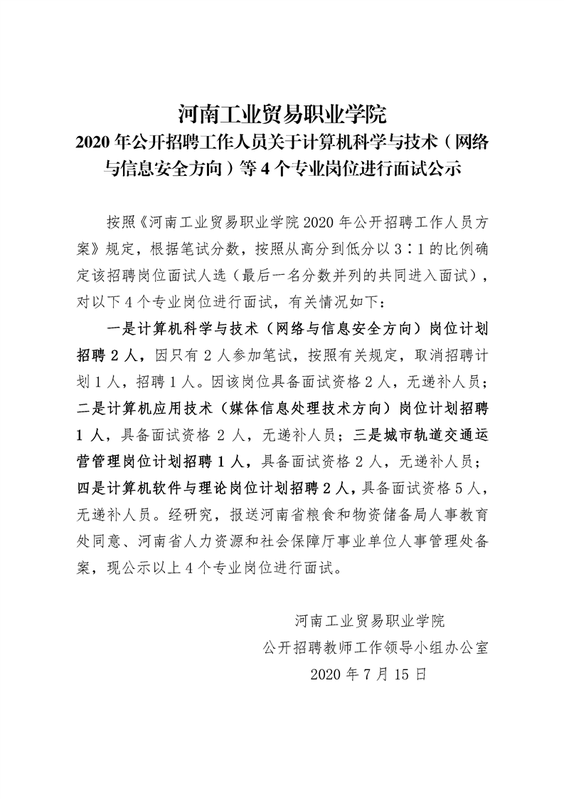 河南工业贸易职业学院2020年公开招聘工作人员关于计算机科学与技术(网络与信息安全方向)等4个岗位进行面试公示