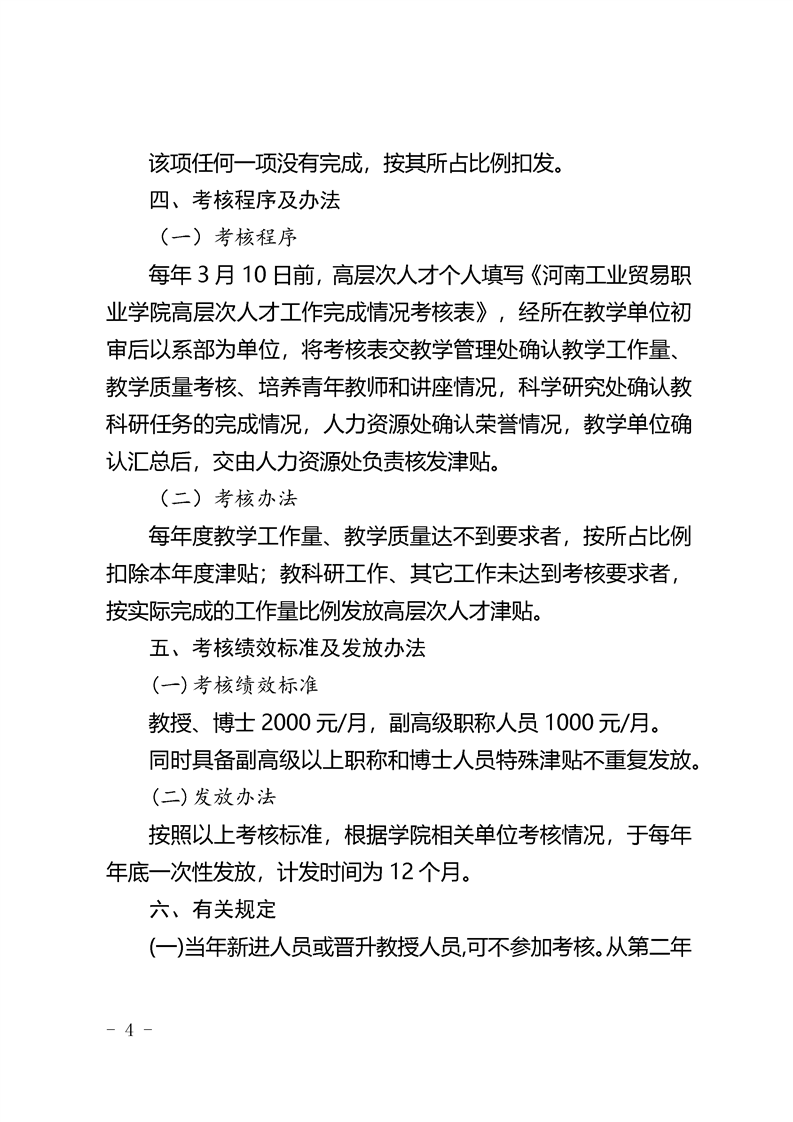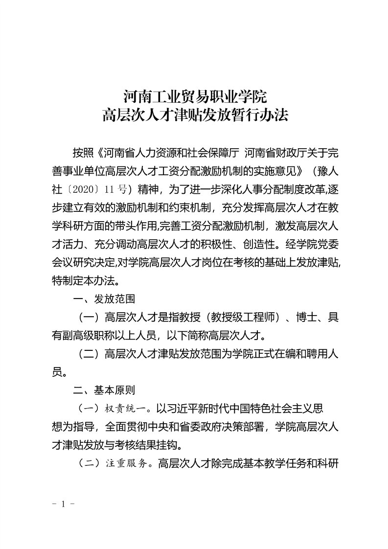 河南工业贸易职业学院 高层次人才津贴发放暂行办法