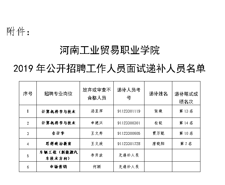 附件:河南工业贸易职业学院2019年公开招聘工作人员面试递补人员名单