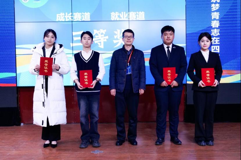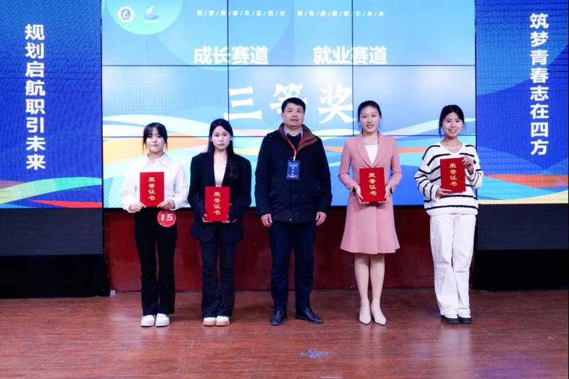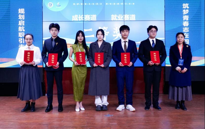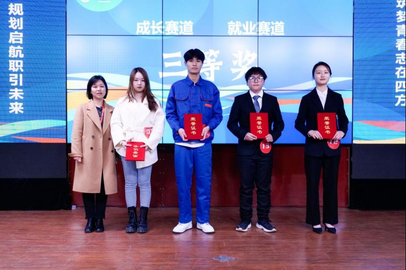 比赛中,成长赛道选手通过个人陈述、现场问答和天降实习0FFER(实习意向)三个环节,全方位呈现了自己的生涯发展报告,系统阐述了自己职业发展规划的科学性和在现阶段为实现个人职业目标所做出的努力成果;就业赛道选手通过个人陈述、综合面试和天降0FFER(录用意向)三个环节,全面展示了自己的求职实战能力,将个人发展路径与经济社会的发展需要的适应度、就业能力与职业目标和岗位要求的契合度进行了详尽说明。用人单位根据选手表现出的综合素质、专业能力、求职实战能力,给出实习或录用意向。经过近五小时的精彩比拼,决出一等奖2名、二等奖6名、三等奖12名。学校将根据本次大赛的成绩排名依次推荐优秀选手参加省赛。