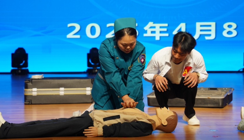 大赛创新融入“生命教育”实践环节。河南省第二人民医院急科主任李瑞娜、护士长李亚莉及团队成员现场进行心肺复苏培训并指导参赛选手实操。柴瑞帅带领寝室长们在医生的指导下学习黄金救援技能。现场还播放了《火场逃生指南》。
