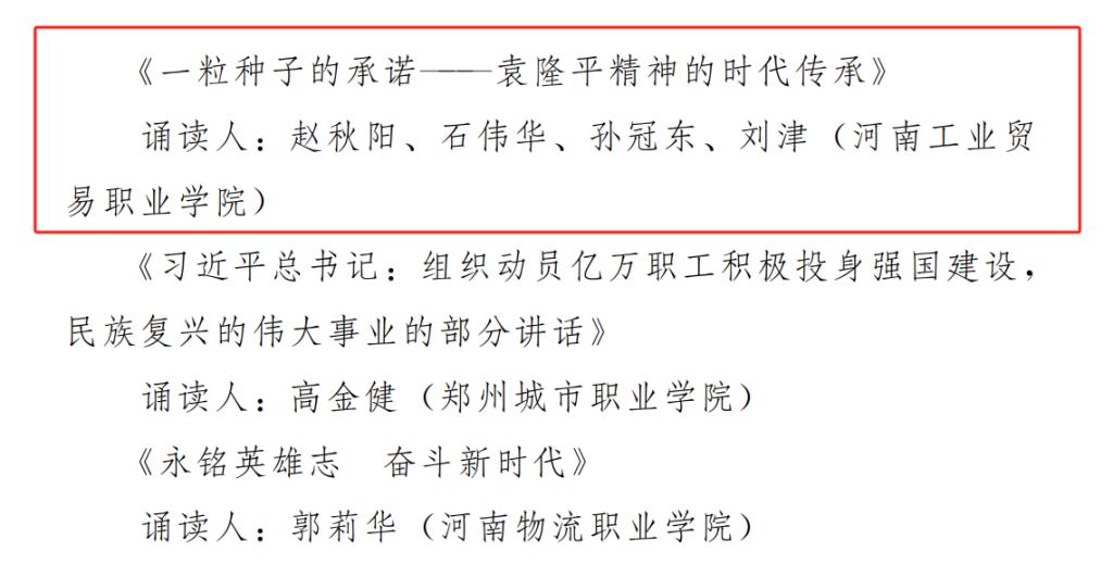 11月6日,我校作品《一粒种子的承诺———袁隆平精神的时代传承》获河南省总工会2025年“悦读新思想”河南省职工经典诵读活动长视频类优秀奖。
