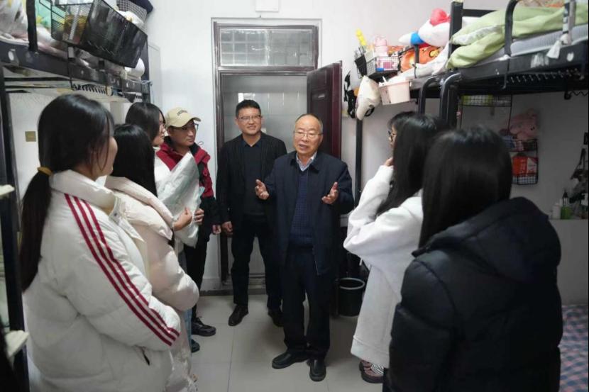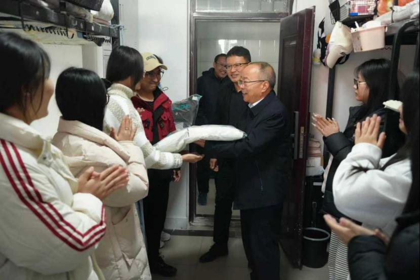 12月10日中午,我校党委书记李国峰、党委副书记柴瑞帅带队,深入龙湖校区3号学生宿舍楼,开展“冬日送温暖”御寒棉衣发放活动。