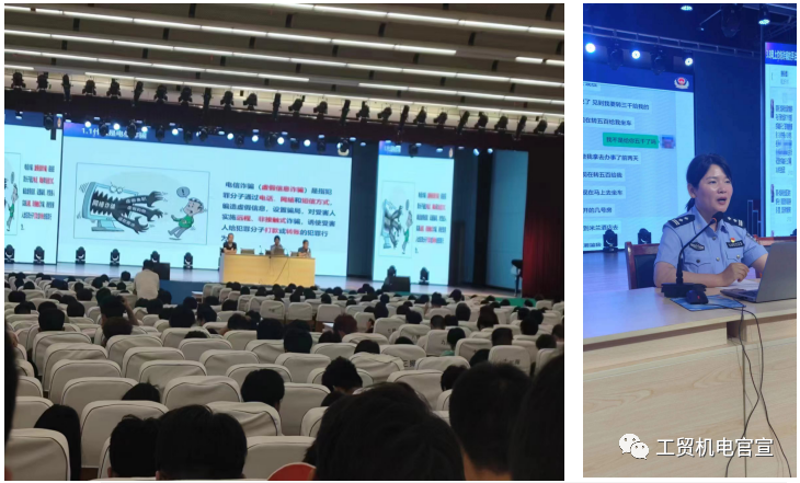同时,为了加强同学们对防诈骗的深刻认识,在5月17日下午6点在学校报告厅,学院邀请到新郑市公安局龙湖派出所的姚静姚警官为同学开展“心有防 诈无门”的专题讲座,机电工程学院全体学生参加。