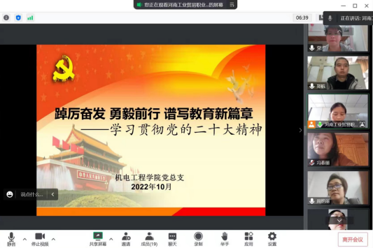 为深入学习贯彻党的二十大会议精神,机电工程学院党总支与10月25日下午在图书馆A1102开展了“踔历奋发 勇毅前行 谱写教育新篇章——学习贯彻党的二十大精神”为主题的线上线下相结合的主题党日活动,围绕党的二十大报告精神进行学习研讨。