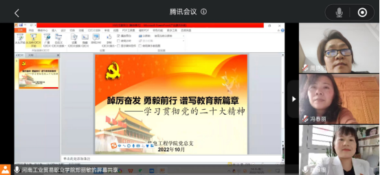 最后,机电工程学院党总支书记卢振江做了发言总结,卢书记对疫情期间各位老师的工作给以肯定,为留校值守值班老师的“舍小家为大家”的牺牲精神表示感谢,要求各位老师要深刻领悟二十大报告精神,要学以致用,把二十大精神落实到学院人才培养工作中,把自己的努力体现在实实在在的工作中,同时希望大家能做好个人防护,平安工作。