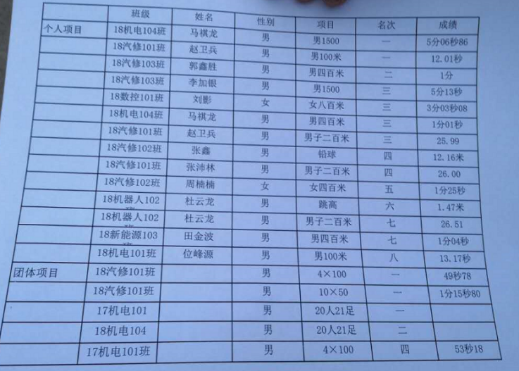 机电工程系共获得男子100米、男子4*100米接力男子10*50米接力、男子1500米以及20人绑腿跑等5个项目全院第一名。18汽修101班获得院团体第二名好成绩。我系获得优秀组织、精神文明奖两项大奖。