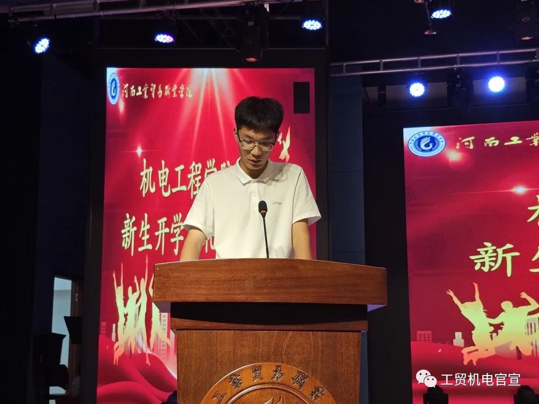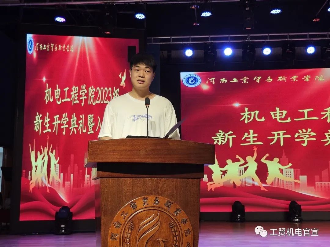接着,2023级新生代表马星辰和老生代表俎鑫源进行发言,马星辰同学表达了对大学生活的向往,号召全体新生要找准人生定位,在新的起点上书写青春篇章;俎鑫源同学结合自己的求学成长经历,向新生们分享了大学生活和学习的经验。