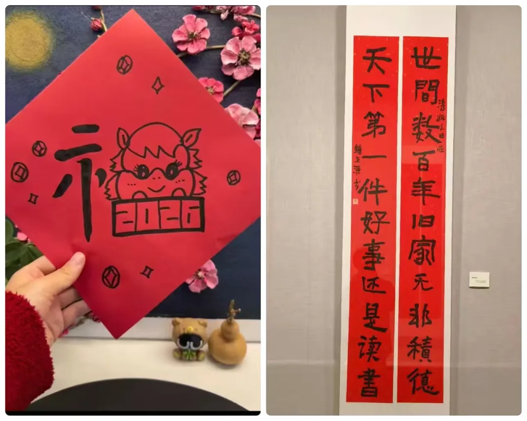 本次书画活动以“市集”形式呈现,学生们围绕“春”“福”“年”等主题,创作书法、国画、篆刻作品。除了传统的楷书“福”字、工笔年画,不少作品融入了国潮元素,如将生肖图案与插画风格结合,让传统艺术焕发新生。