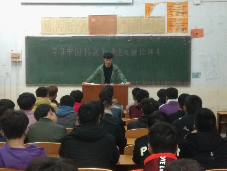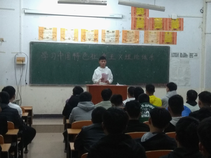 各班的团支书向同学们讲述了党的十九大提出的新时代、新思想、新矛盾、新目标,为我们不忘初心,牢记使命,高举中国特色社会主义伟大旗帜,决胜全面建成小康社会,夺取新时代中国特色社会主义伟大胜利,实现中华民族伟大复兴的中国梦明确了行动指南。这些新理论,是马克思主义中国化最新成果,是中国特色社会主义理论体系的重要组成部分,为马克思主义理论的丰富和发展增添了光辉的一页。