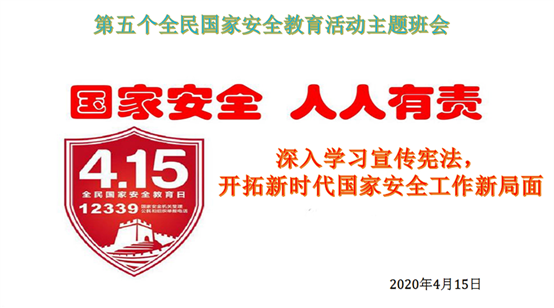 2020年4月15日是第5个“全民国家安全教育日”。为深入学习贯彻习近平新时代中国特色社会主义思想,坚持总体国家安全观,着力推动国家安全教育工作在高校的深入开展,增强广大师生国家安全意识,及时防范化解重大风险,决胜新冠肺炎疫情防控阻击战,根据省高工委、省教育厅《关于开展2020年全民国家安全教育日宣传教育活动的通知》(教思政[2020]103号)要求,机电工程系以此为契机,组织学生进一步学习了国家安全的有关知识,并举办了以“国家安全 人人有责”为题的主题班会活动,全系有1653名同学参与了网上学习和答题活动,在学习的过程中,我们的学习得到了事倍功半的效果。