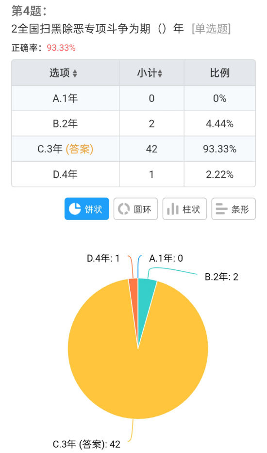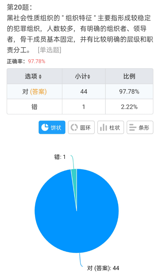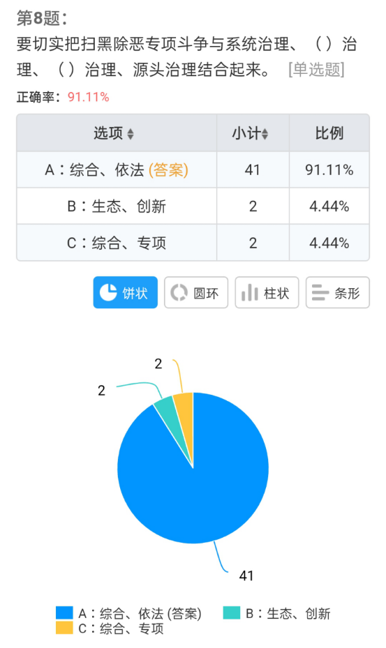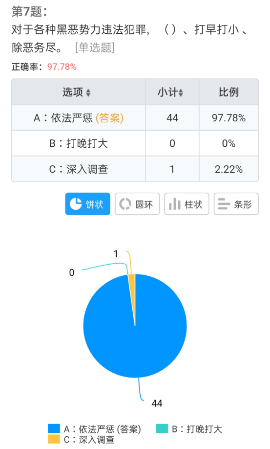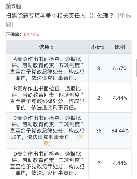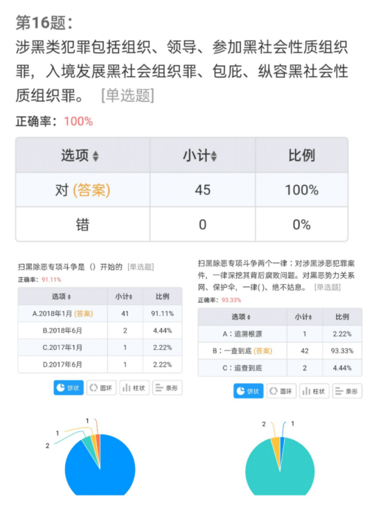 为贯彻落实习近平新时代中国特色社会主义思想和《中共中央国务院关于开展扫黑除恶专项斗争的通知》精神,切实增强开展扫黑除恶专项斗争的责任感和使命感,保护全体师生的合法权益,机电工程系举办了扫黑除恶专项斗争网上答题。机电工程系共有45名教师,全部参与答题,正确率都在85%以上。