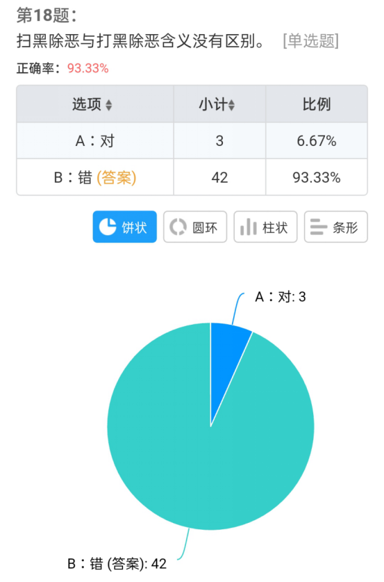 通过此次答题活动,大大提高了教师的防范意识,大家纷纷表示通过考试在学深悟透的基础上掌握了要义、理解了主旨、明确了方向。在接下来的扫黑除恶专项斗争工作中一定提高政治站位,明确责任,确保扫黑除恶专项斗争工作攻坚克难、除恶必尽、务求实效。