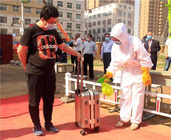 老师扮演的学生或是背着背包或是拉着行李箱,沿着隔离道走到入口处,相隔1.5米排队有序等候检测。行李消毒、身份验证、体温测量、绿码出示,每一项流程严格通过后,“同学们”终于可以拿着领取的口罩、消毒用品安全有序进入校园。