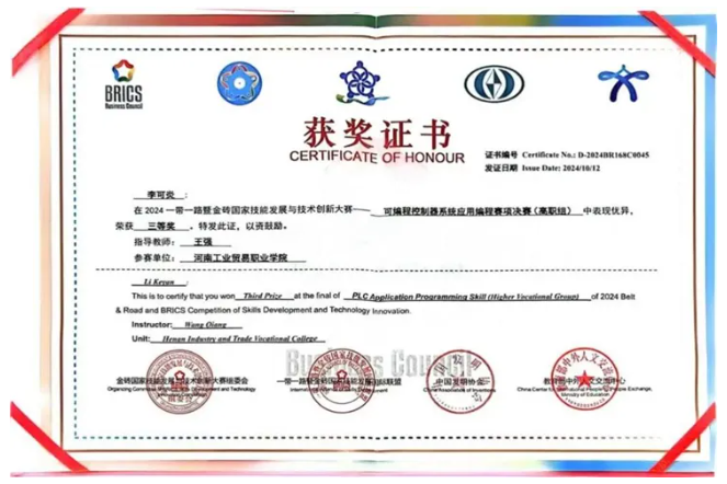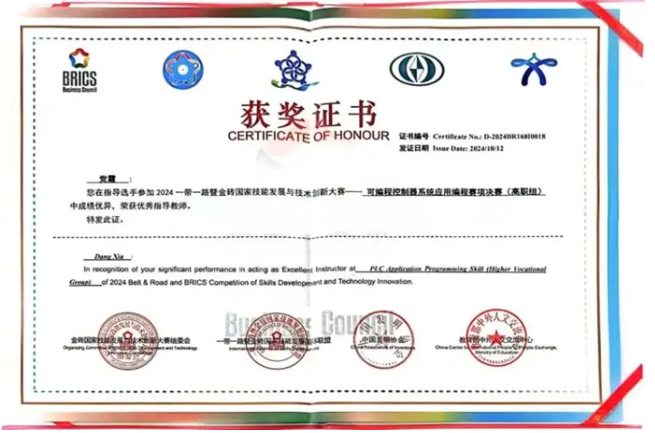 2024年10月12日,捷报传来!在刚刚闭幕的2024一带一路暨金砖国家技能发展与技术创新大赛“可编程控制器系统应用编程赛项”中,我校获得优秀组织奖等多项荣誉,学校国家级竞赛类又添新奖牌。