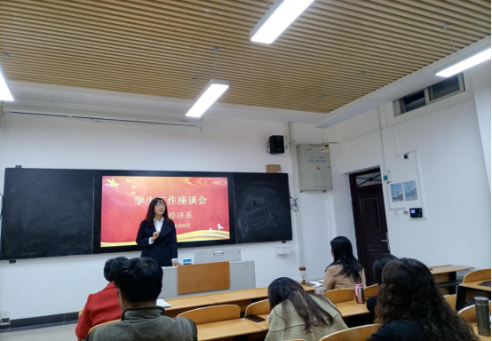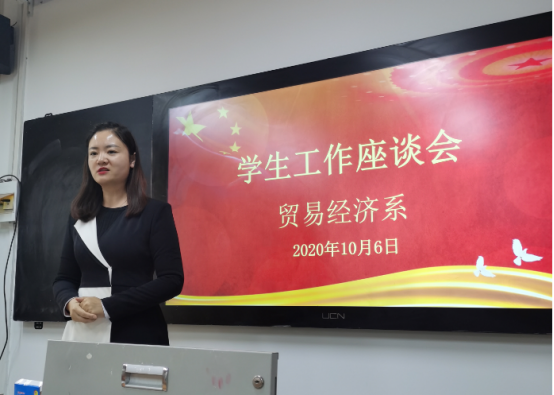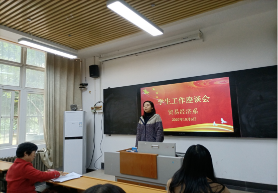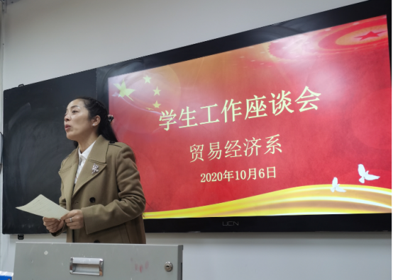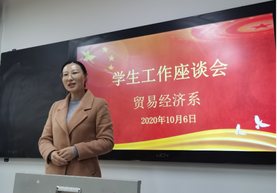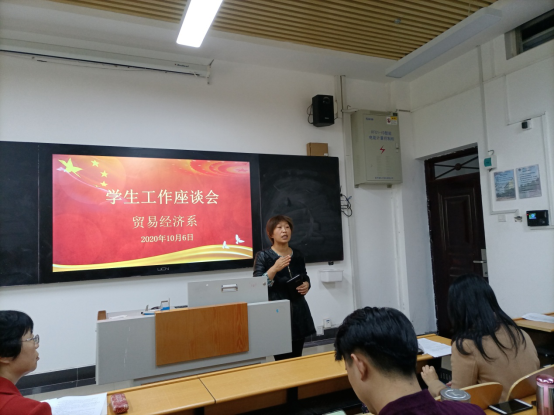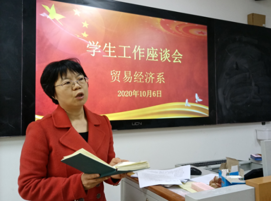 经济贸易学院学管主任潘娅媚主持了会议。潘娅媚首先传达了学院学生工作有关会议精神,然后汇报了一年来学院学生工作总体情况。潘娅媚指出,我系学生工作总体平稳有序,辅导员们舍小家顾大家,付出了辛勤的劳动。疫情期间,23名辅导员日夜工作,70个自然班3469名学生做到不落一人进行信息核对,精准掌握每个学生的行踪及健康状况。开学以后,辅导员们深入班级,按照学院党委要求组织思政第一课,上好安全教育课,按照系部署每天紧盯学生健康安全情况,严格纪律,组织活动,建立良好的班风。同志们工作多年都有很多的感慨,感想。