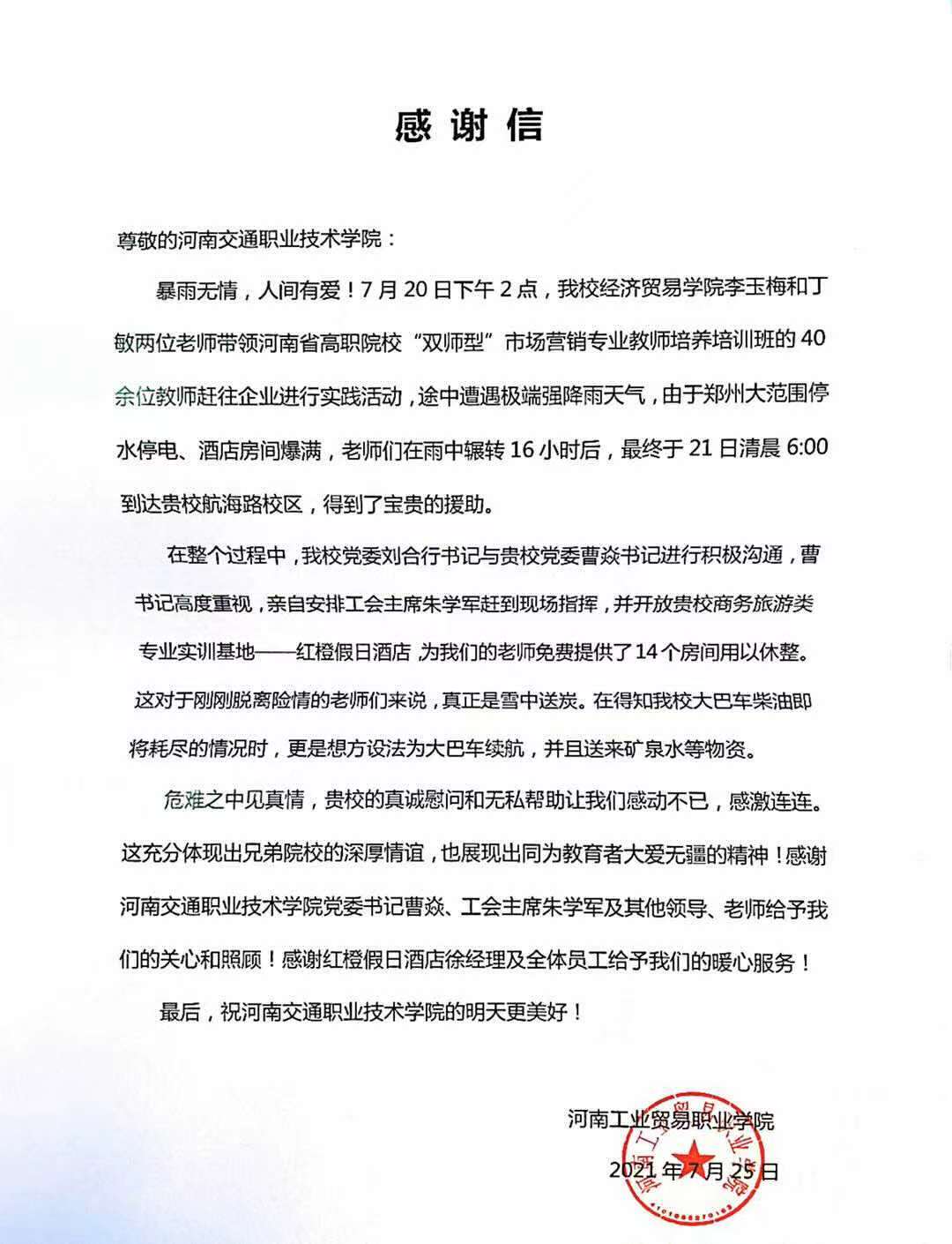 危难之中见真情,贵校的真诚慰问和无私帮助让我们感动不已,感激连连。这充分体现出兄弟院校的深厚情谊,也展现出同为教育者大爱无疆的精神!感谢河南交通职业技术学院党委书记曹焱、工会主席朱学军及其他领导、老师给予我们的关心和照顾!感谢红橙假日酒店徐经理及全体员工给予我们的暖心服务!