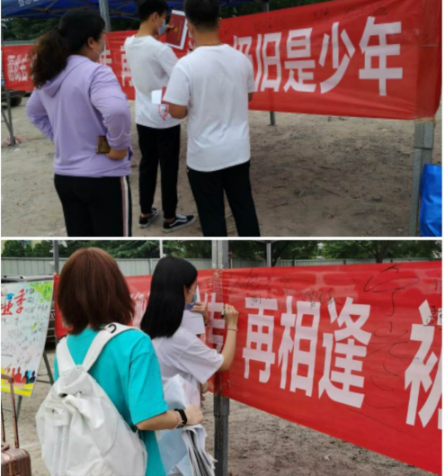 一大早,辅导员们就上下忙碌布置好了接待帐篷和横幅标语,等候同学们的归来。同学们返校归心似箭,8点钟两名学生率先到达接待点。