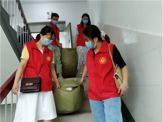 从六楼搬运行李下楼比较困难,为不耽误学生们当天回家,志愿服务的老师们不顾天气炎热,帮助学生把行李从六楼搬运到一楼大厅。