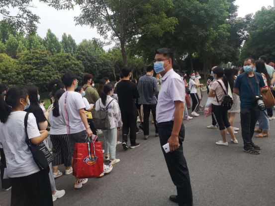 辅导员教师们亲自送考,给学生送去了鼓励和关怀,这给予考生极大的踏实感和安全感,因为学生知道他们的老师会耐心守候到考试的最后一秒。