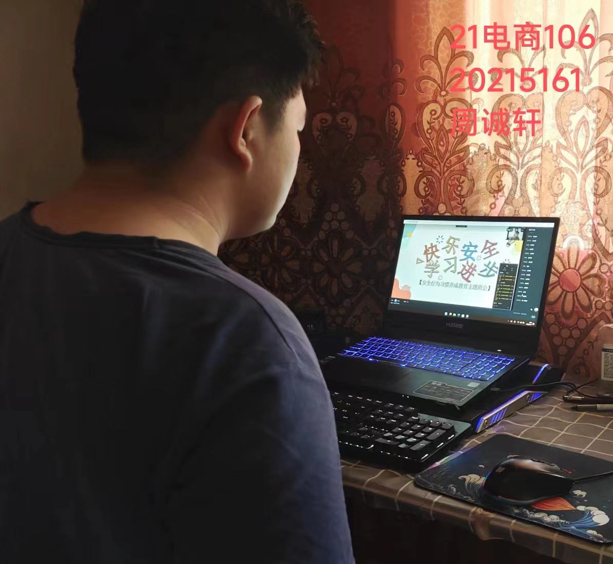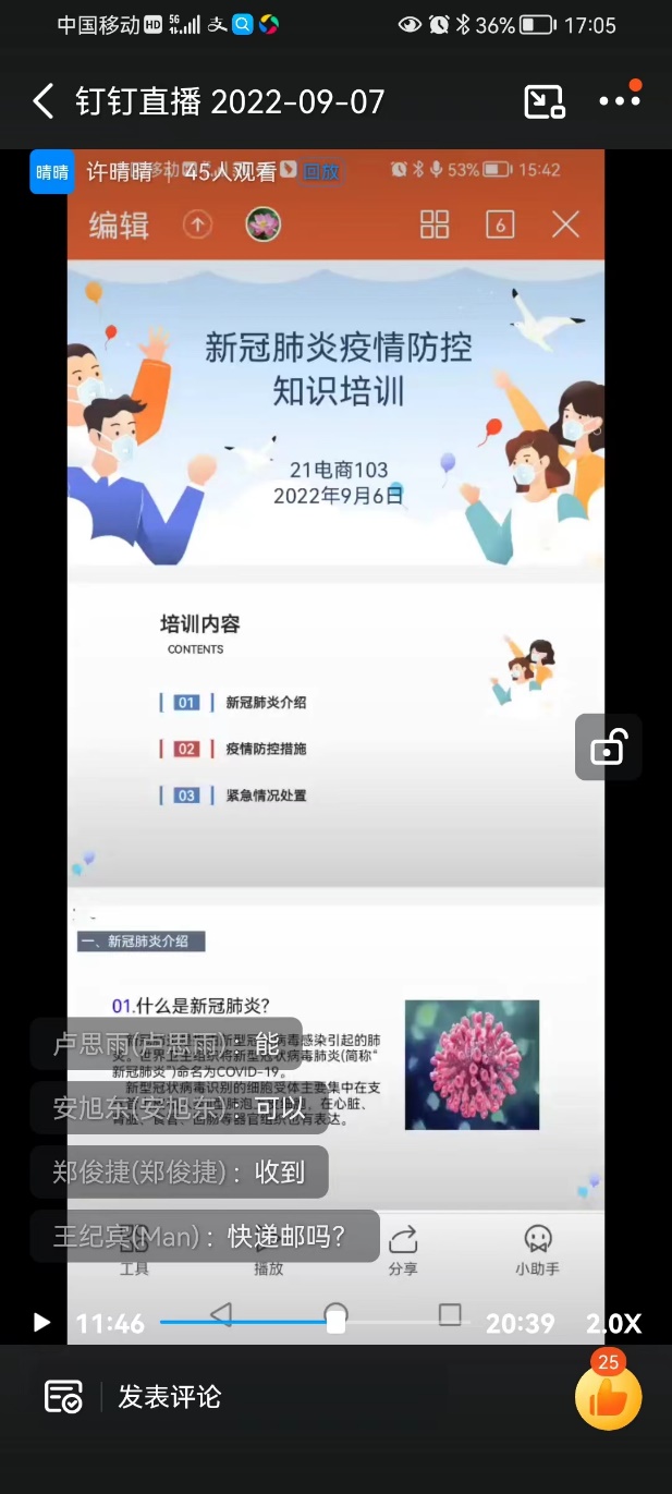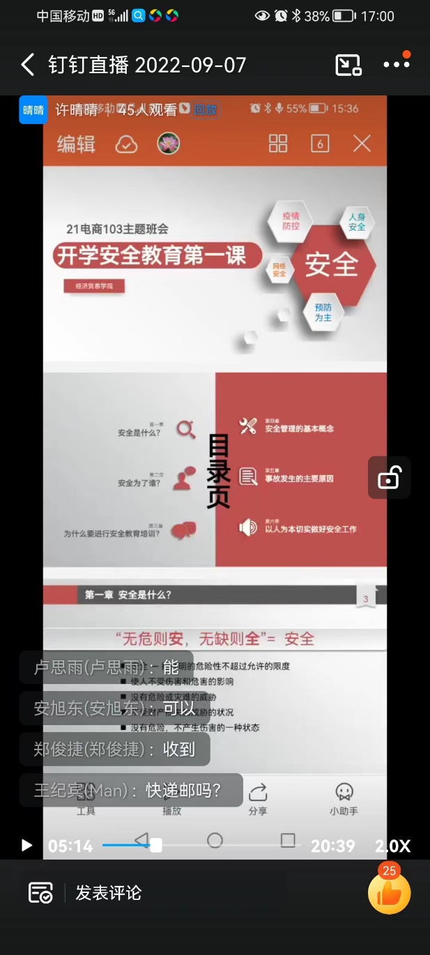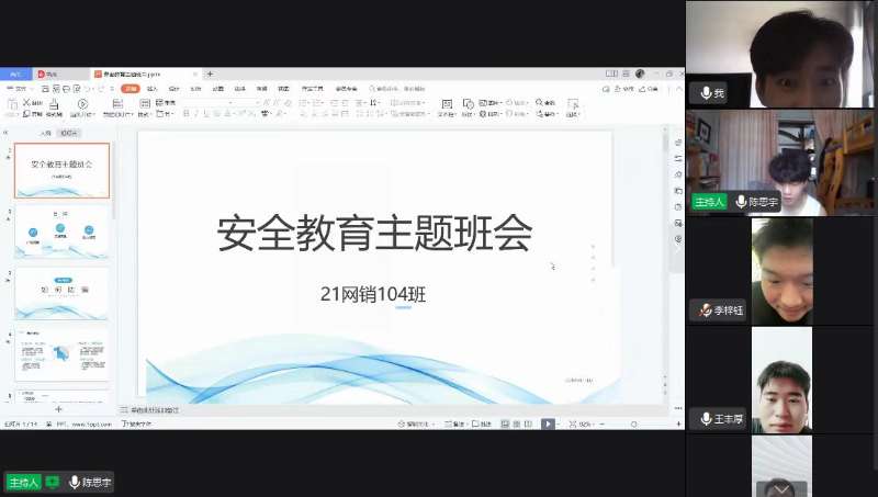 21网销104班辅导员刘晓利为顺利开展此次班会,组织班委提前参与各种安全知识的搜集与整理,会议从近期发生的财产安全、地震安全、交通安全、消防安全、用电安全、水灾等多方面让学生了解了各种防灾避险知识与注意事项,并对所见所闻的真实安全事故作出分析。整个直播会议在严肃认真而不失简单活泼的气氛中进行,会议纪律良好,流程衔接顺畅,会议进行的方式多样,包括班委发言,普通同学发言和学生讨论。在介绍防骗和传销、安全知识竞答两个环节气氛最为活跃,同学们主动配合,用心参与到会议中来,在互动中提高了自身安全意识和处理突发状况的潜力。