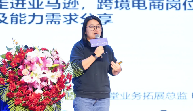 主旨演讲环节,亚马逊全球开店官方讲堂业务拓展总监吴晶珏就《走进亚马逊,跨境电商岗位分布及能力需求分享》为主题,围绕亚马逊的发展历程、跨境人才岗位分析和站内运营全局分析等三个话题分享了自己的观点。